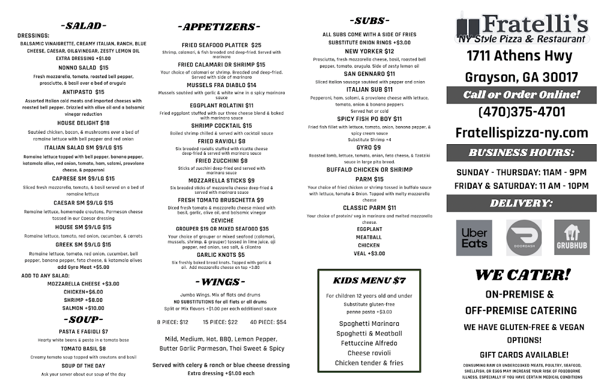 Welcome to Fratelli's NY Style Pizza and Restaurant, an authentic slice of New York right in the heart of Grayson, Georgia. Located conveniently at 1711 Athens Hwy, this delightful eatery has garnered a reputation for delivering not just food, but cherished moments for families, friends, and food lovers alike. The vibrant atmosphere, coupled with exceptional service, creates an inviting space for anyone looking to indulge in classic Italian fare.