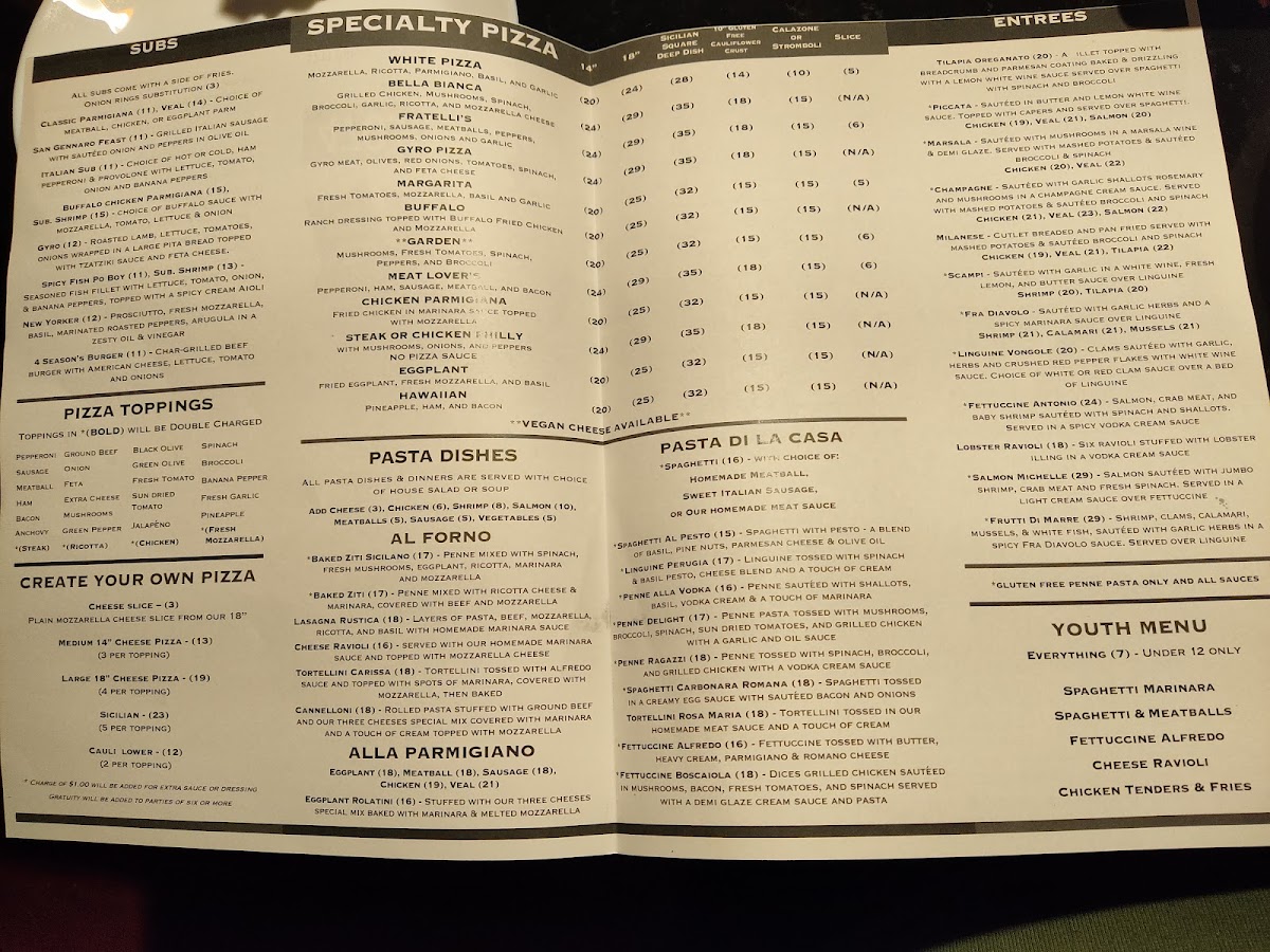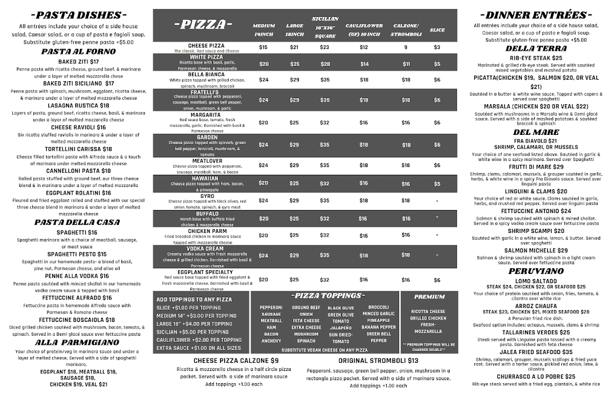 Particularly appealing are the decadent offerings like the Original Calzone, filled with a generous helping of ricotta and mozzarella cheese, served with a side of rich marinara for US$12.00. Entrée lovers can indulge in dishes like the Piccata, sautéed in a luscious lemon white wine sauce, or the Marsala, richly accented with mushrooms and served with wholesome sides. These dishes highlight a commitment to high-quality ingredients and meticulous preparation, ensuring every bite is memorable.